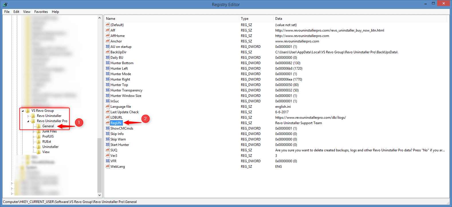 В редакторе реестра вам нужно дерево навигации, чтобы добраться до следующих клавиш: HKEY CURRENT USER \ Software \ VS Revo Group \ Revo Uninstaller Pro \ General