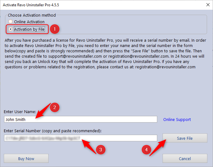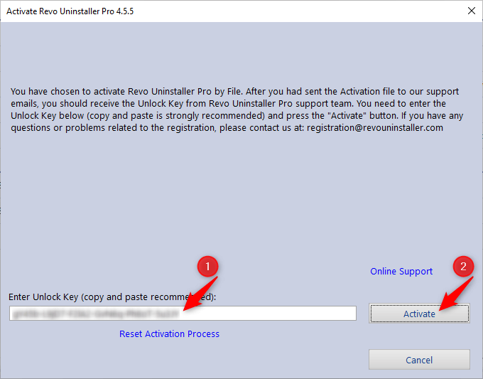 Устанавливаемая версия Revo Uninstaller Pro поддерживает два способа активации: онлайн - активацию и активацию по файлу. Если компьютер, активирующий Revo Uninstaller Pro, не подключен к Интернету или онлайн - активация по какой - то причине не работает, метод активации файла является альтернативой. Активация файла требует создания специального файла RUPAF и отправки его нам в качестве вложения. Затем мы отправим вам ключ разблокировки.