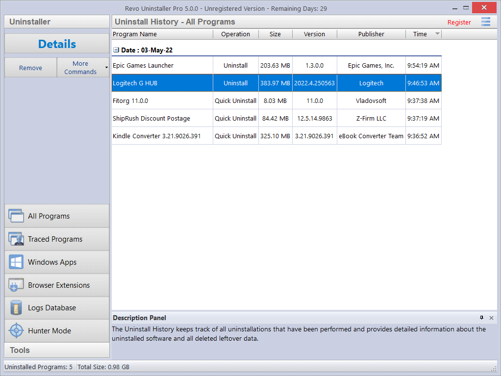 Принудительная разгрузка также может быть использована с одной из других функций Revo Uninstaller Pro (база данных журналов), чтобы найти лучший способ полностью и чисто удалить программу и ее потенциальные оставшиеся данные.